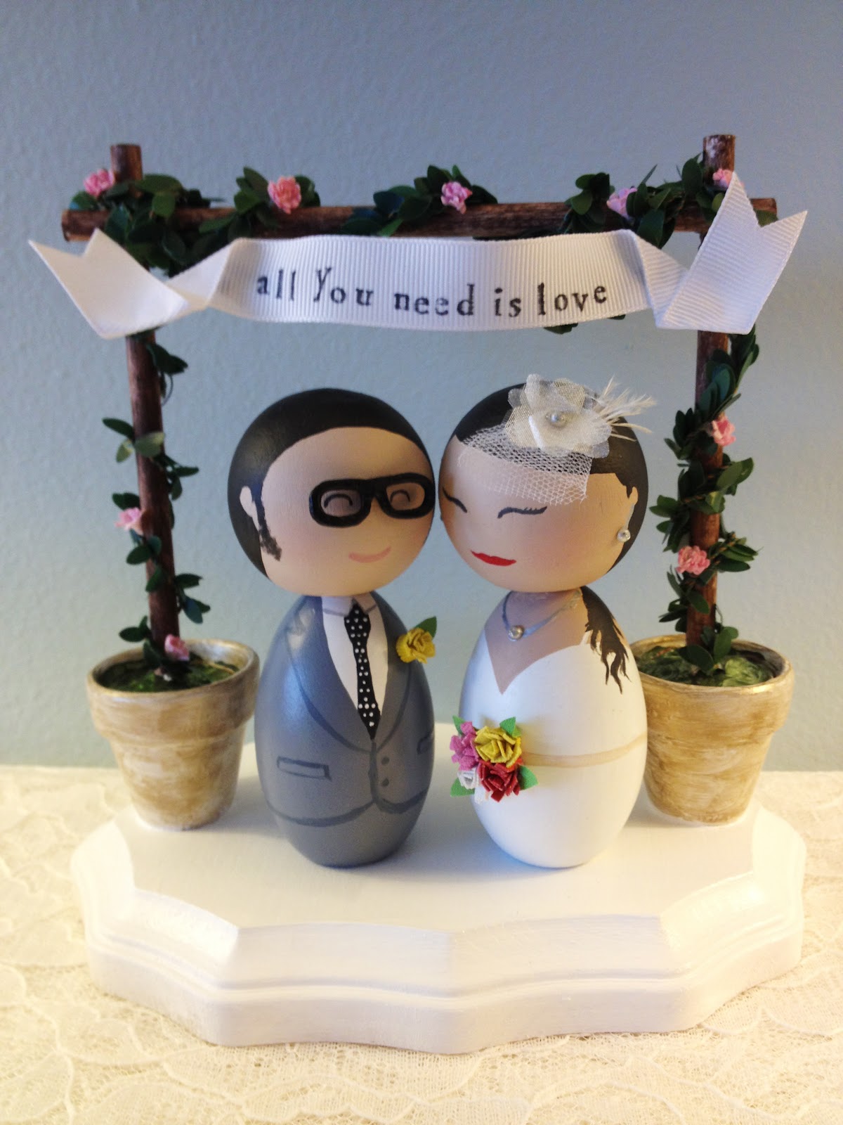 I had a so much fun making these "hipster" wedding cake toppers for a recent client. I love the little feather details on the veil and the Groom's ultra cool glasses. I also photographed the toppers in one of my new custom bases. I love the way they look under the "all you need is love" banner! Super cute and super fun wedding cake toppers!